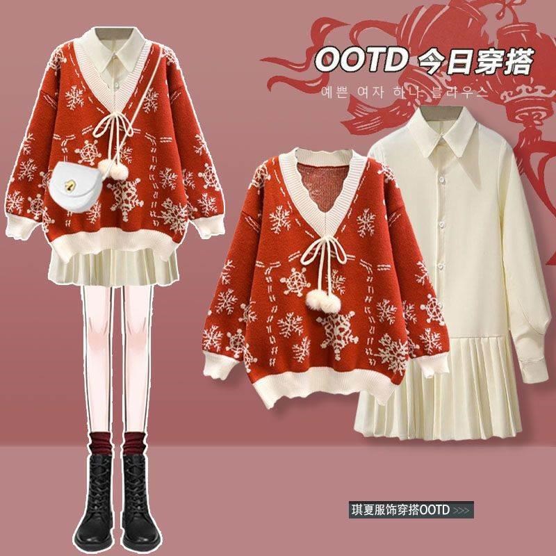 秋冬穿搭女2024新款圣诞洋气设计感红色毛衣搭小个子衬衫裙两件套