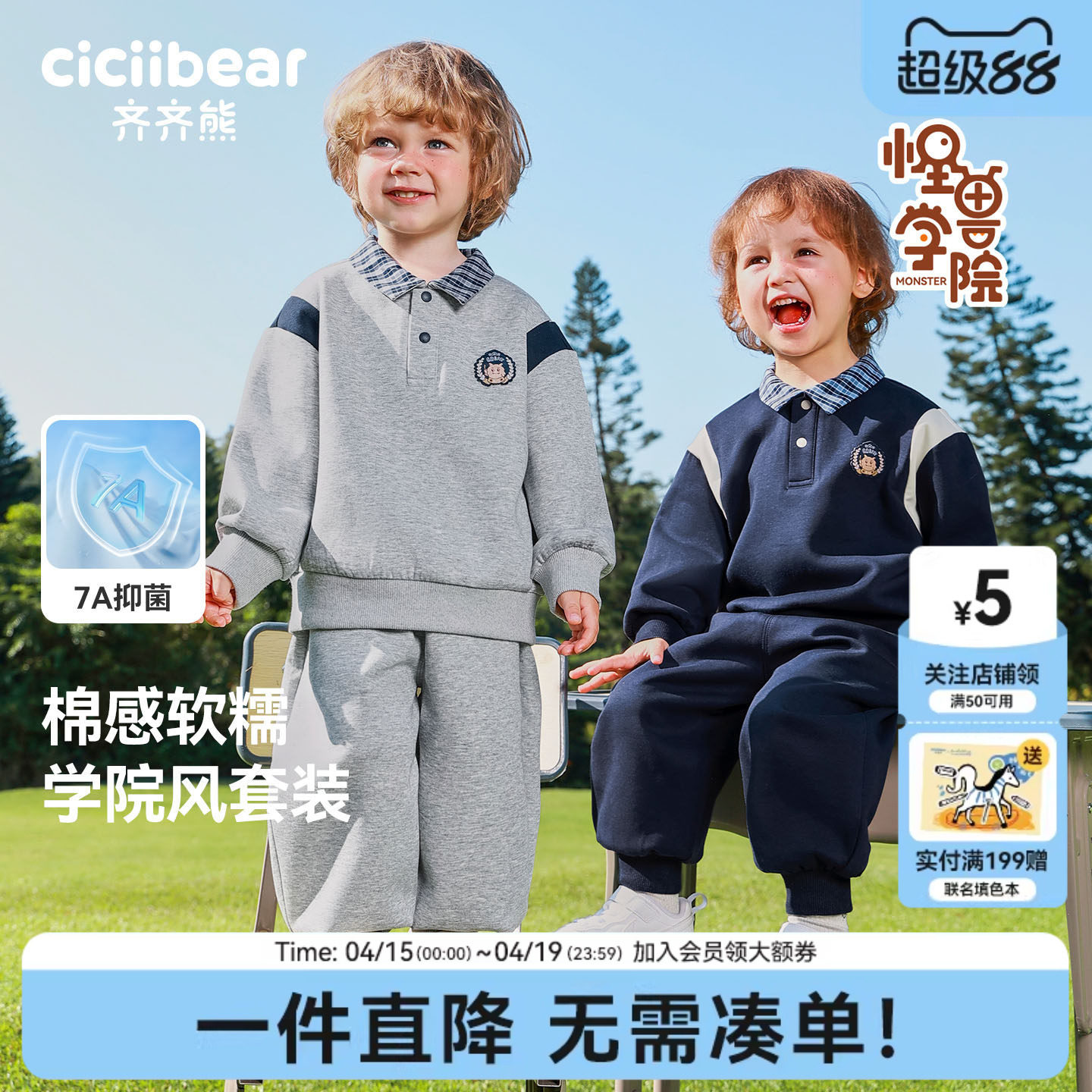 [7A抗菌亲肤棉]齐齐熊宝宝学院风卫衣套装男童春款运动儿童入园服