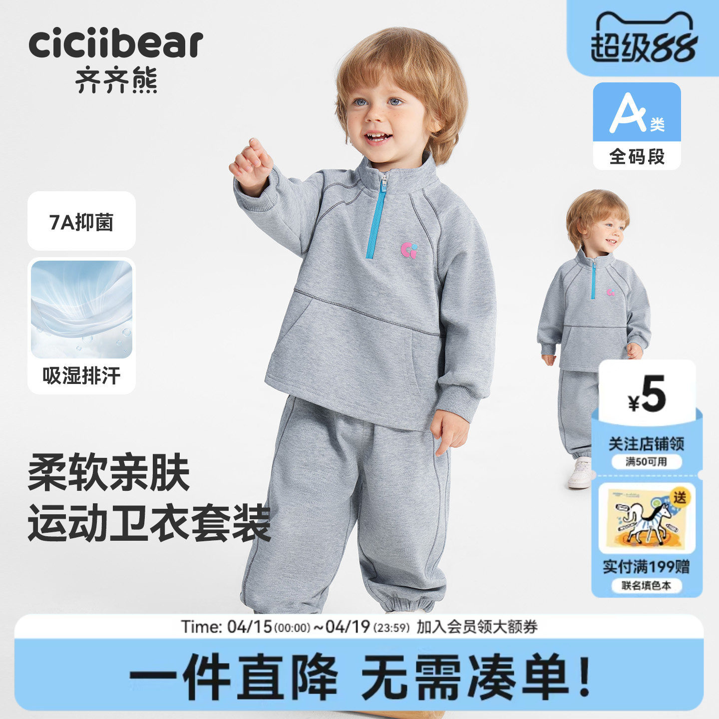 [半开襟7A抗菌]齐齐熊宝宝卫衣套装男童春款2026新款儿童运动吸湿