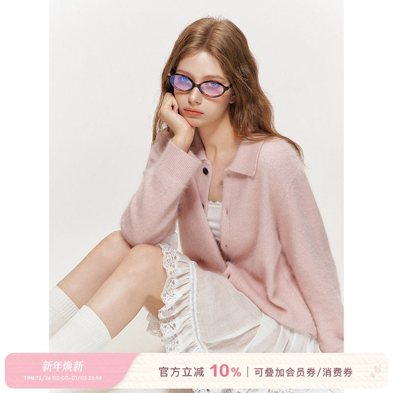 孔雪儿同款 Kroche 兔毛+绵羊毛 休闲宽松粉色翻领针织开衫外套