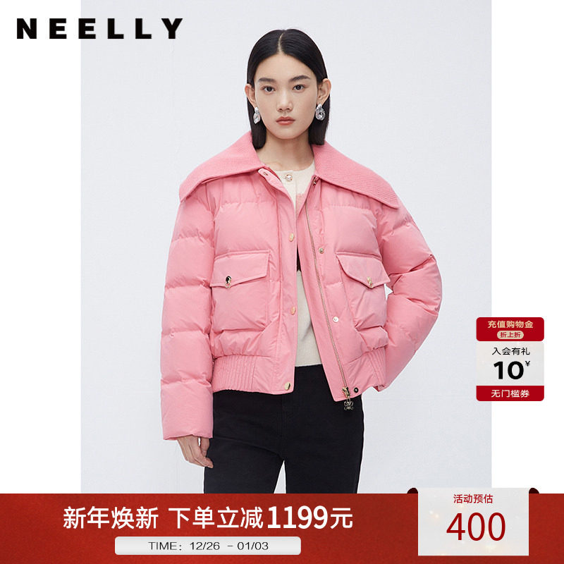 NEELLY纳俪商场同款粉色面包服女冬时尚大翻领保暖休闲短款羽绒服