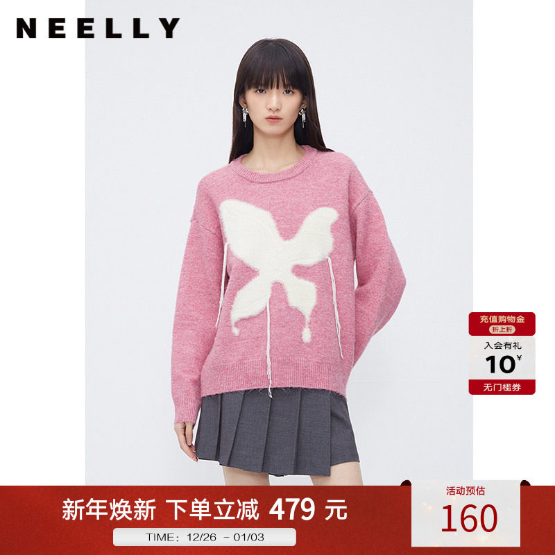NEELLY纳俪商场同款粉色毛衣女冬季甜美宽松流苏超好看慵懒风毛衣