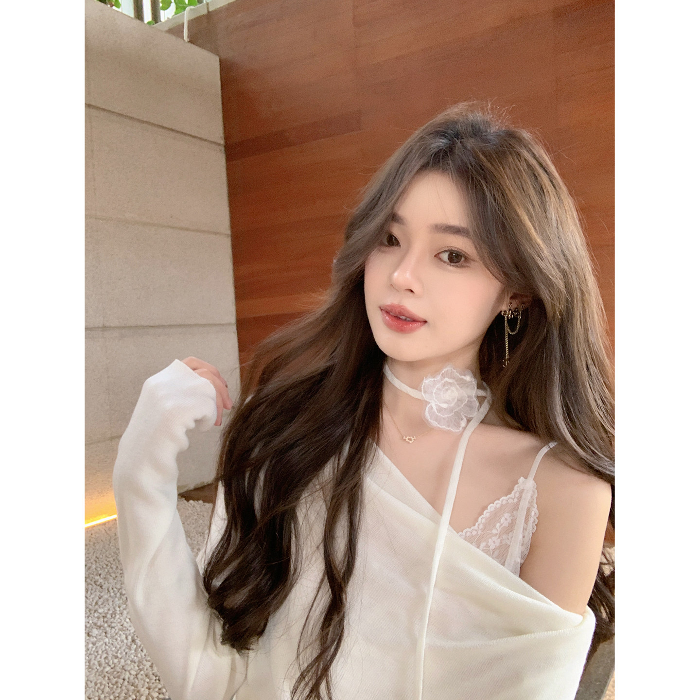 ByYou 薄款长袖露肩羊毛针织衫上衣套装女白色蕾丝吊带背心两件套