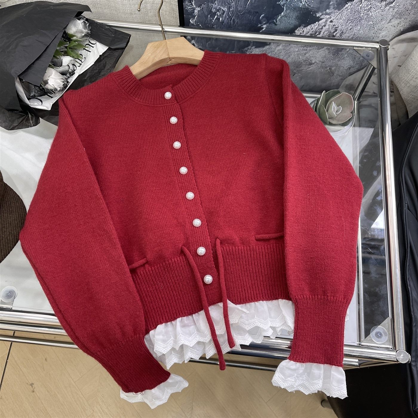 设计感蕾丝拼接假两件针织开衫女短外套毛衣轻奢气质打底毛衫上衣
