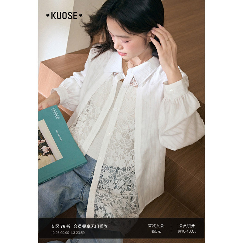 单件/套装 2025春秋新款假两件衬衫女拼接蕾丝针织衬衣领上衣小衫