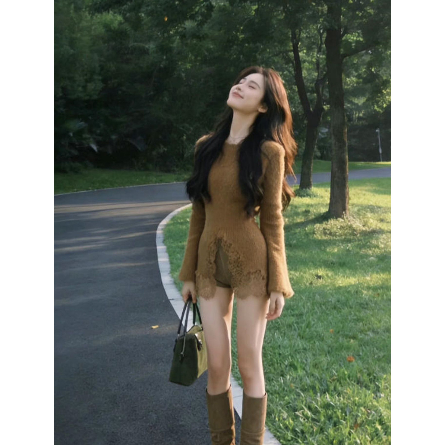 慵懒感蕾丝拼接打底针织衫上衣女新款减龄百搭修身短裤子两件套装
