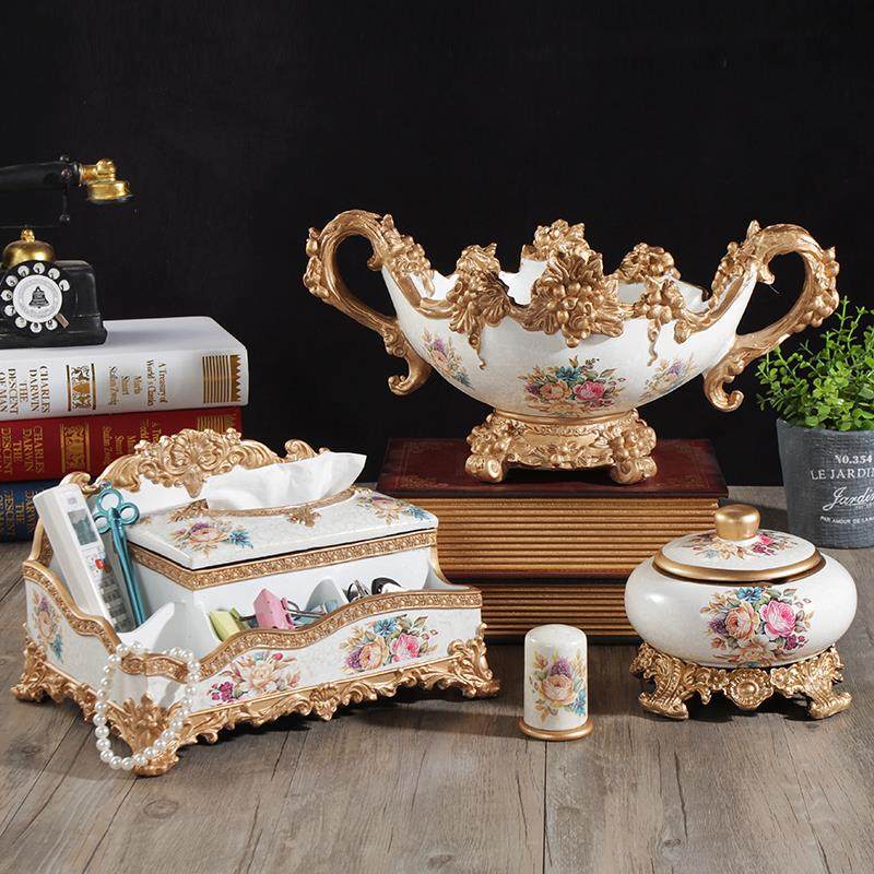 欧式果盘套装家居客厅装饰工艺品多功能纸巾盒树脂三件套茶几摆件