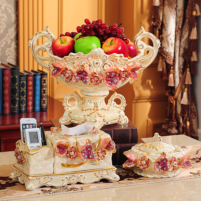 欧式果盘套装奢华创意现代客厅家用纸巾盒陶瓷水果盘三件套装摆件