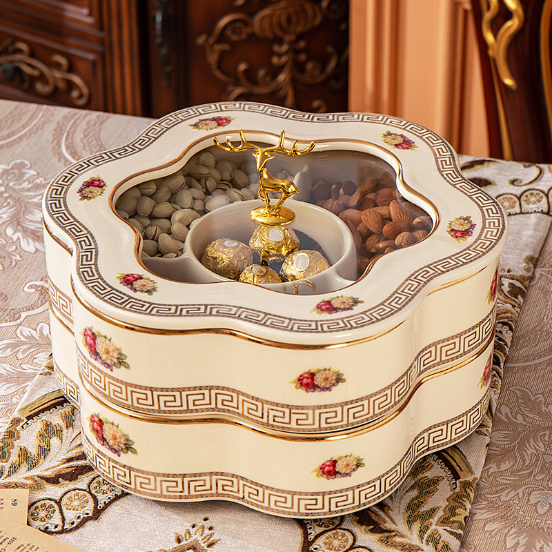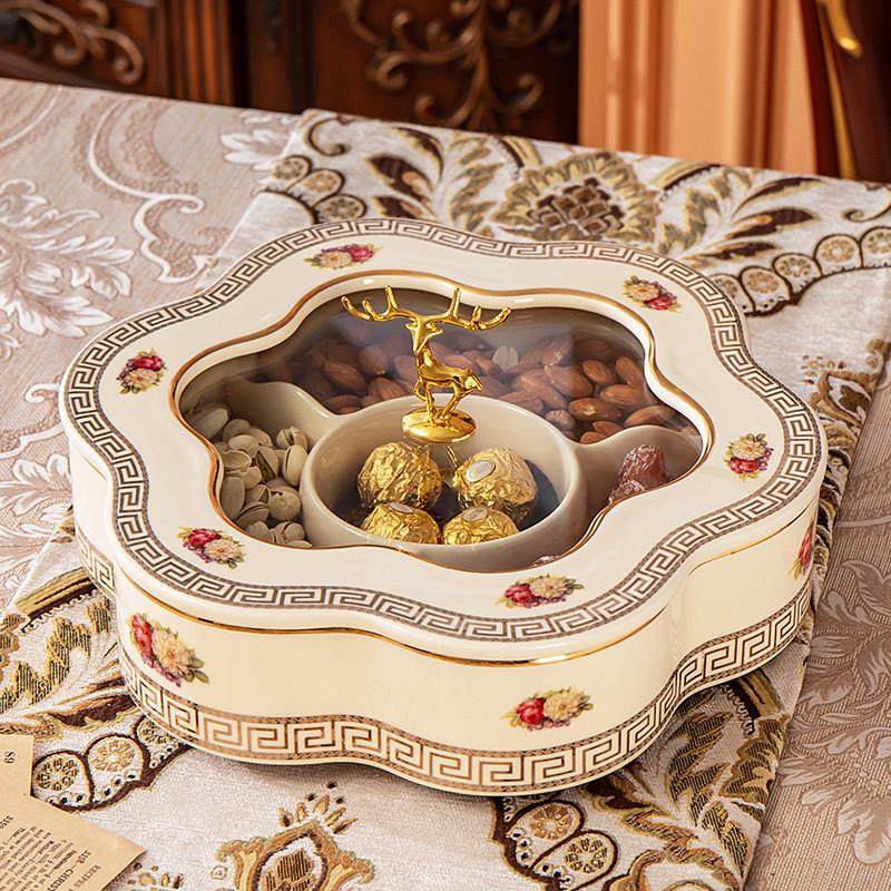 欧式果盘套装客厅奢华高档婚庆新年陶瓷糖果干果盘收纳盒分格带盖