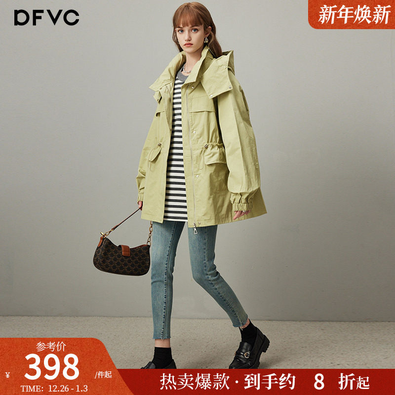 dfvc韩版中长款风衣外套女2025年秋季新款连帽收腰显瘦工装上衣