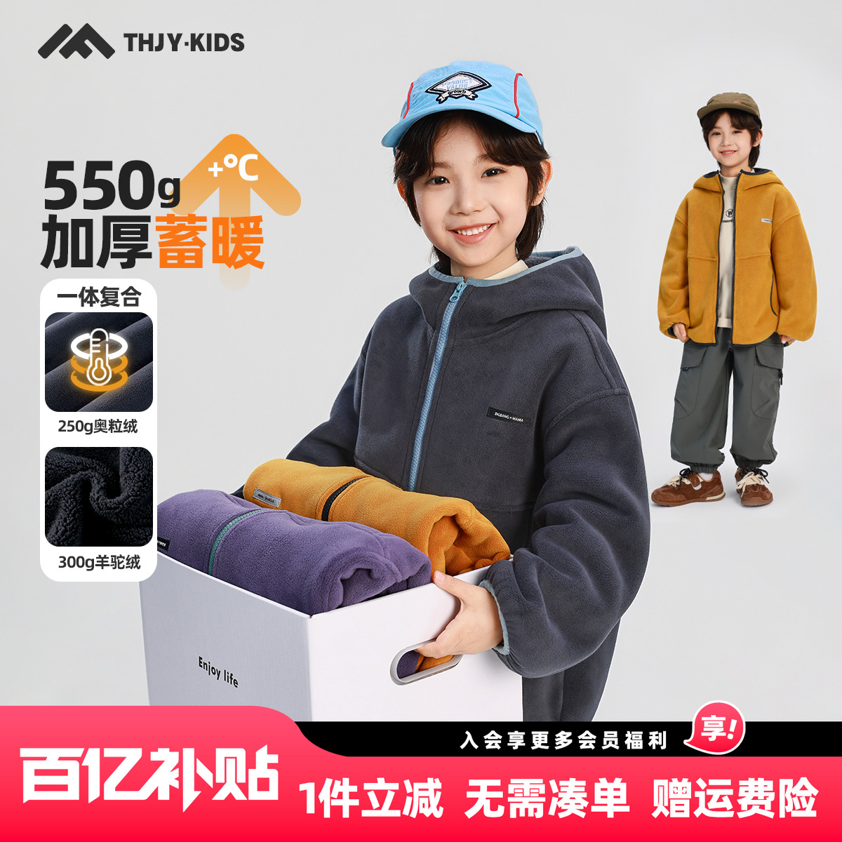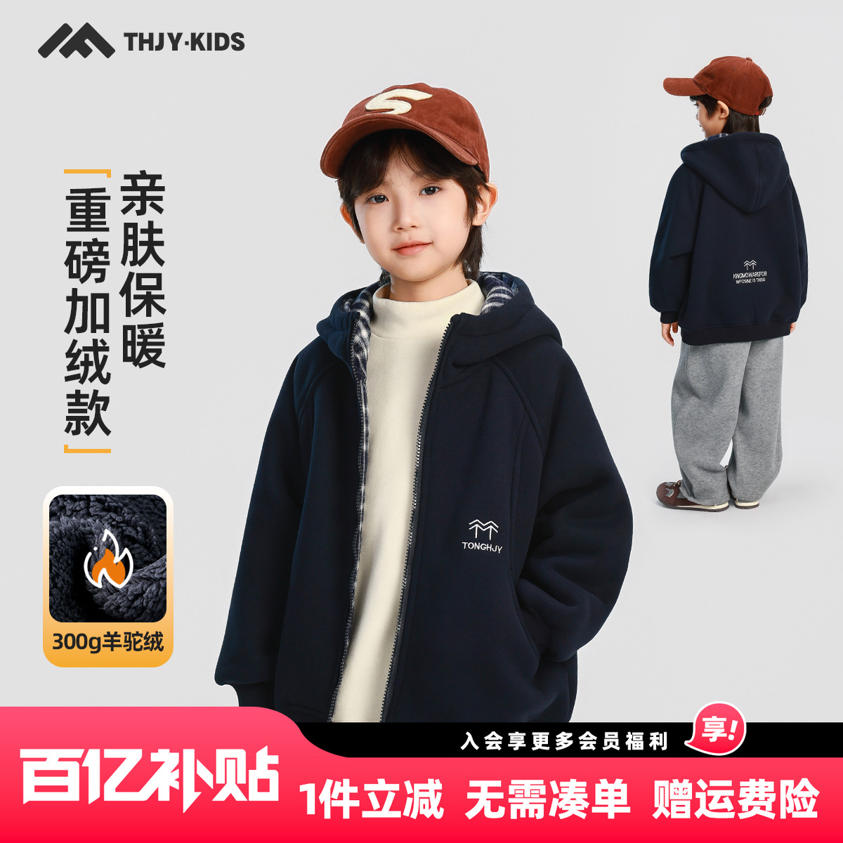 嘟嘟家儿童外套冬款男童连帽加绒外衣女童洋气加厚冬装摇粒绒上衣