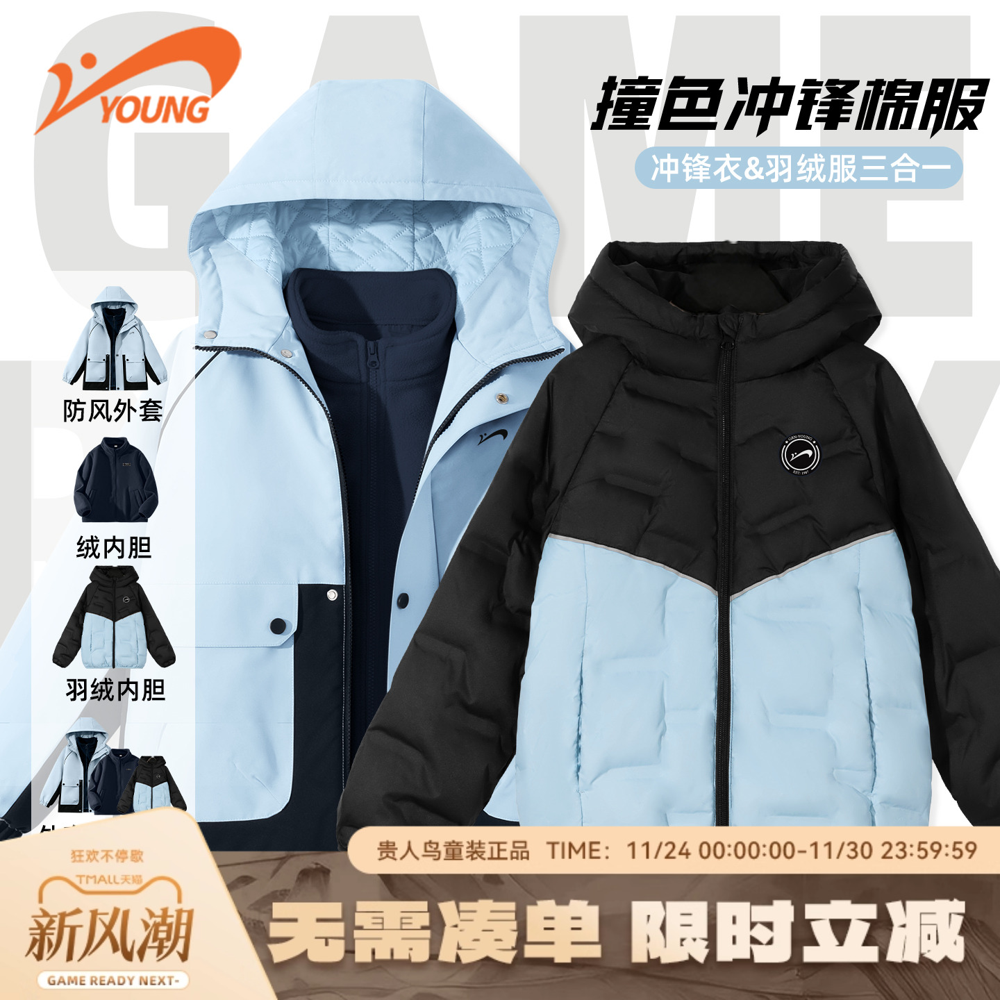 贵人鸟童装男童羽绒服冲锋衣大童三合一冬装夹棉外套儿童冬季棉服