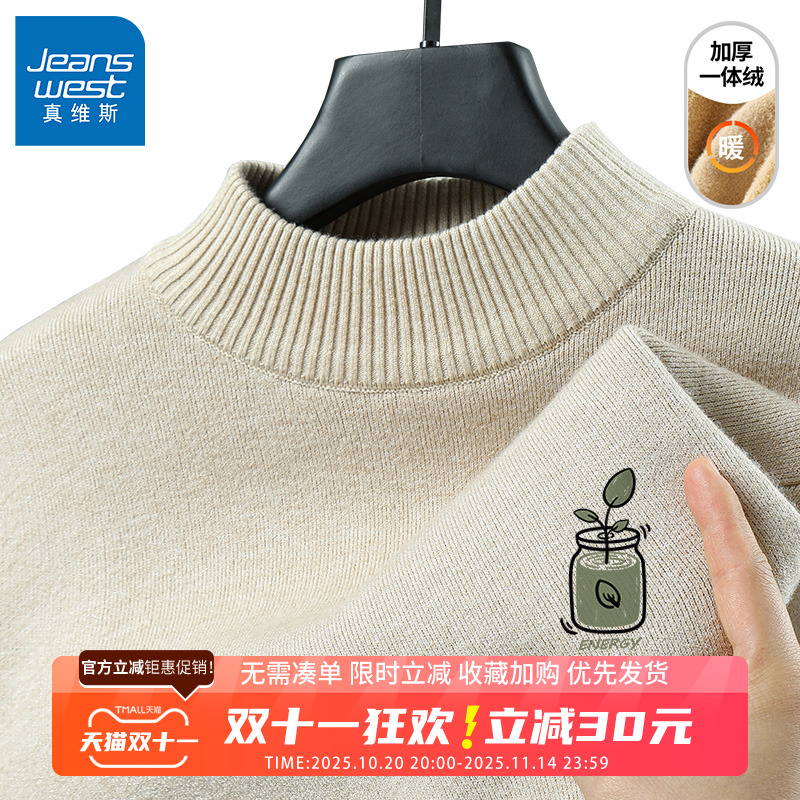 GV真维斯半高领毛衣男冬季加厚一体绒内搭打底青春潮流男士上衣B