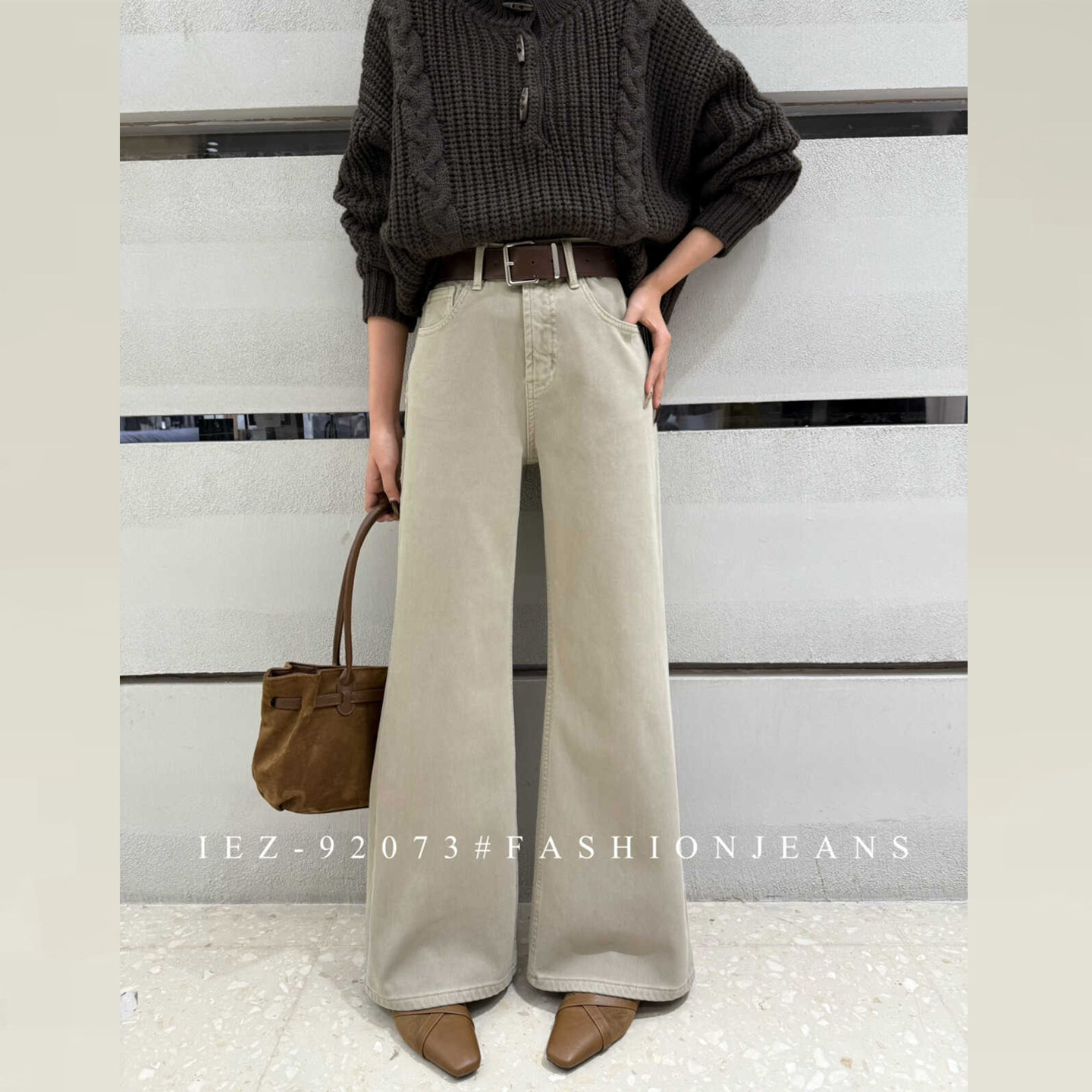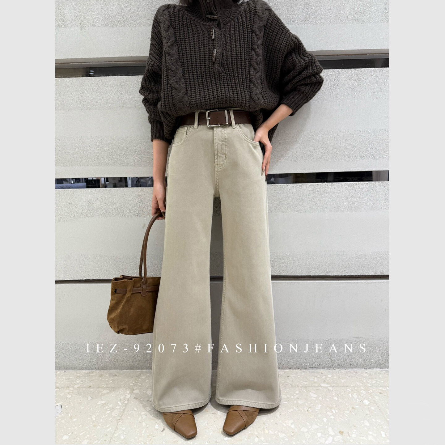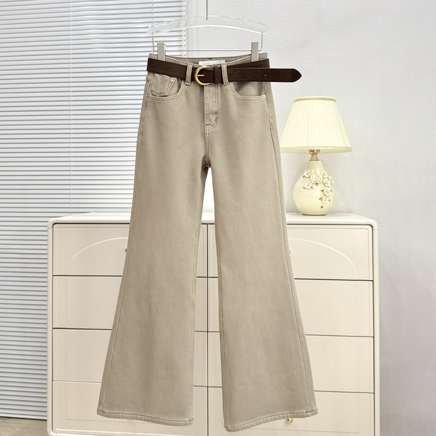 ISMX奶茶色加绒牛仔裤女新款版型超好看的卡其色裤子不贴腿微喇裤
