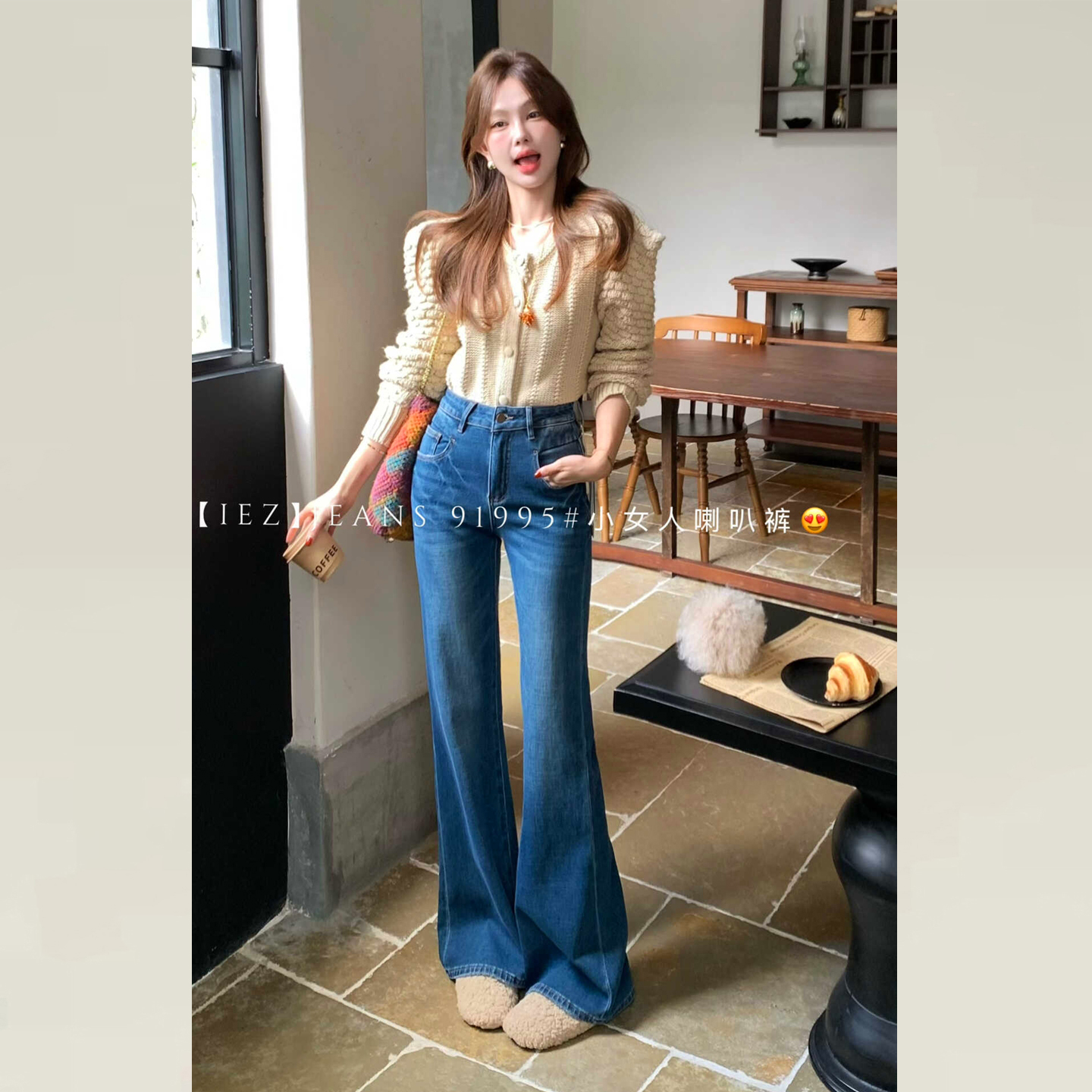 iez秋冬加绒牛仔裤新款女版型超好看的裤子高腰显瘦不贴腿微喇裤
