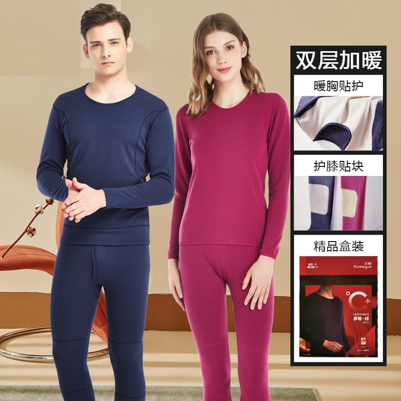 三枪保暖内衣男加绒加厚护膝贴块发热防寒冬季女打底秋衣秋裤套装