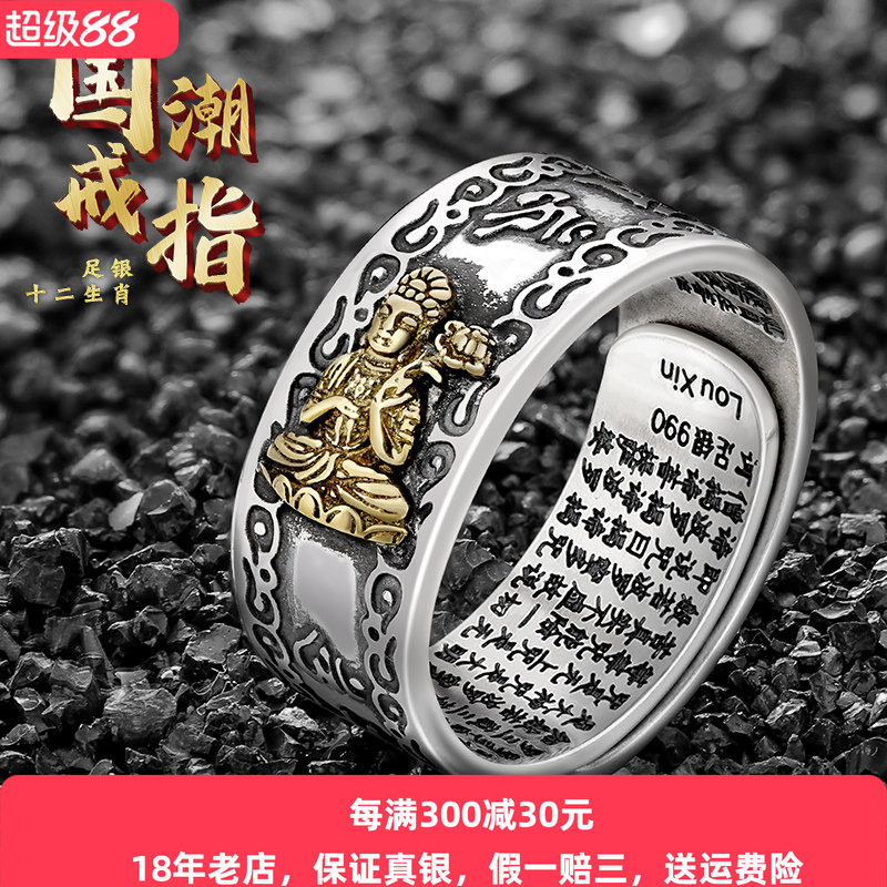 S999六字真言纯银戒指男士国潮貔貅单身可转动旋转食指环网红尾戒