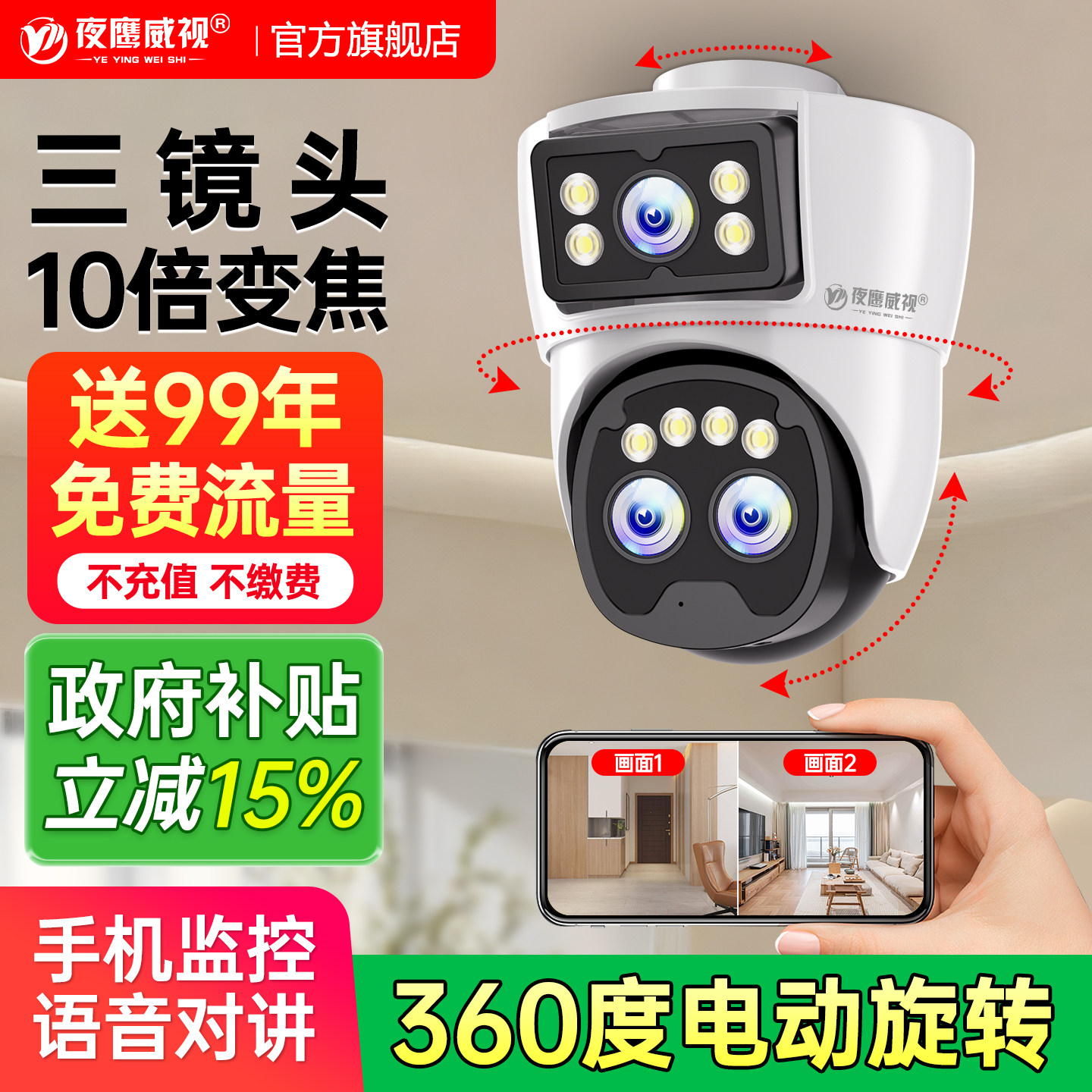 摄像头监控器双画面可通话360度无死角手机远程家用客厅无线wifi语音互动夜视高清智能店铺室内外护儿童老人