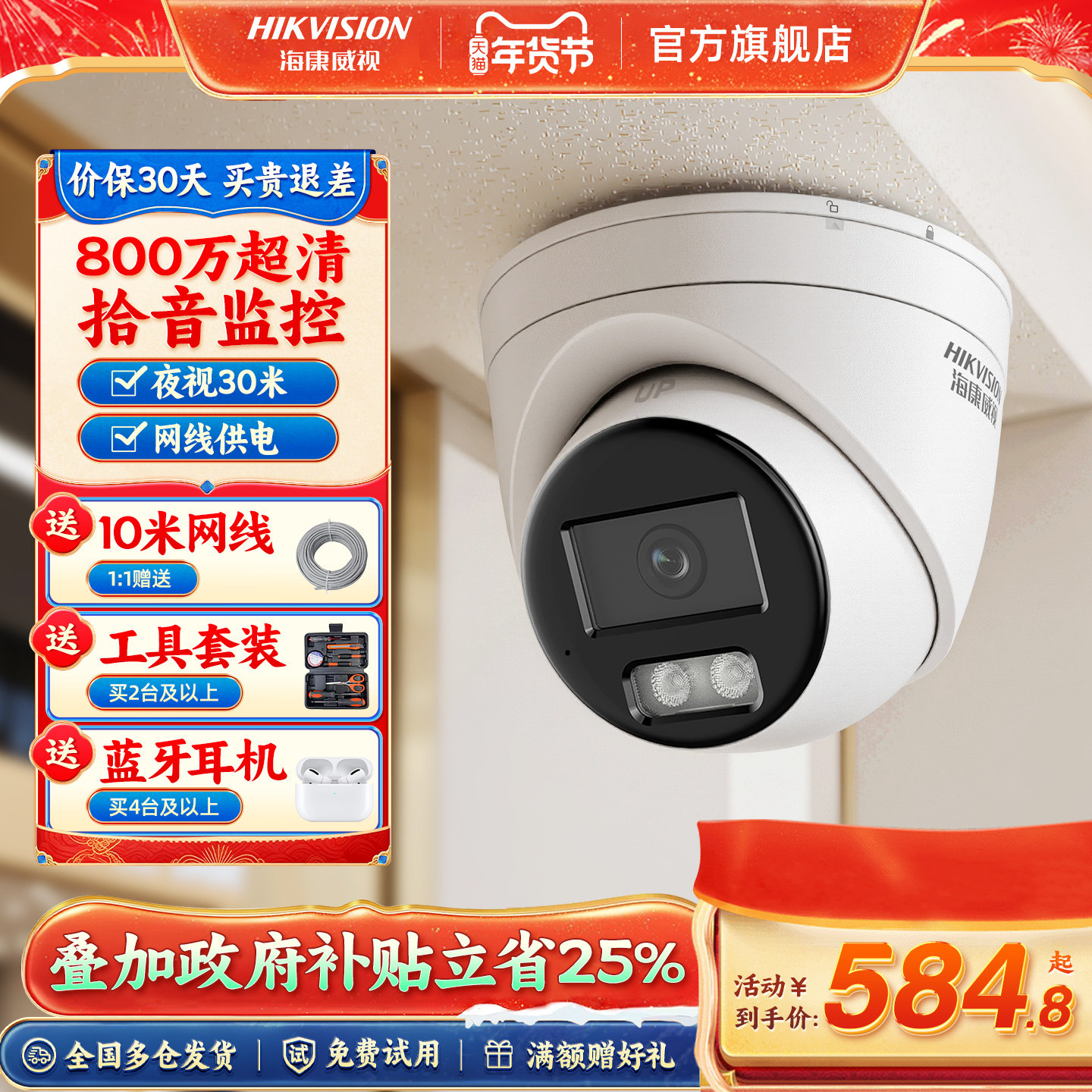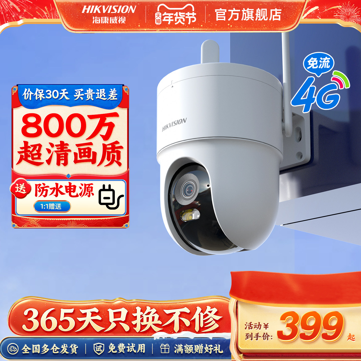 海康威视智能摄像头4G终身免流量500/800万高清夜视全彩商用超市店铺手机远程360度全景无死角室外监控摄影头