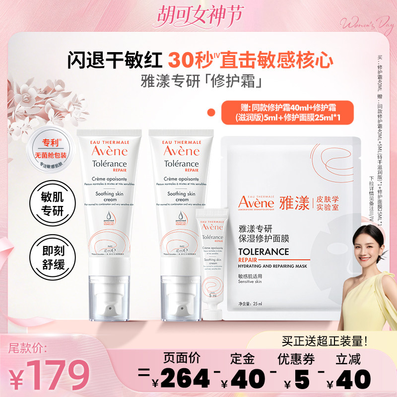 【胡可38女神节】雅漾专研修护霜40ml保湿面霜舒缓补水褪泛红乳液