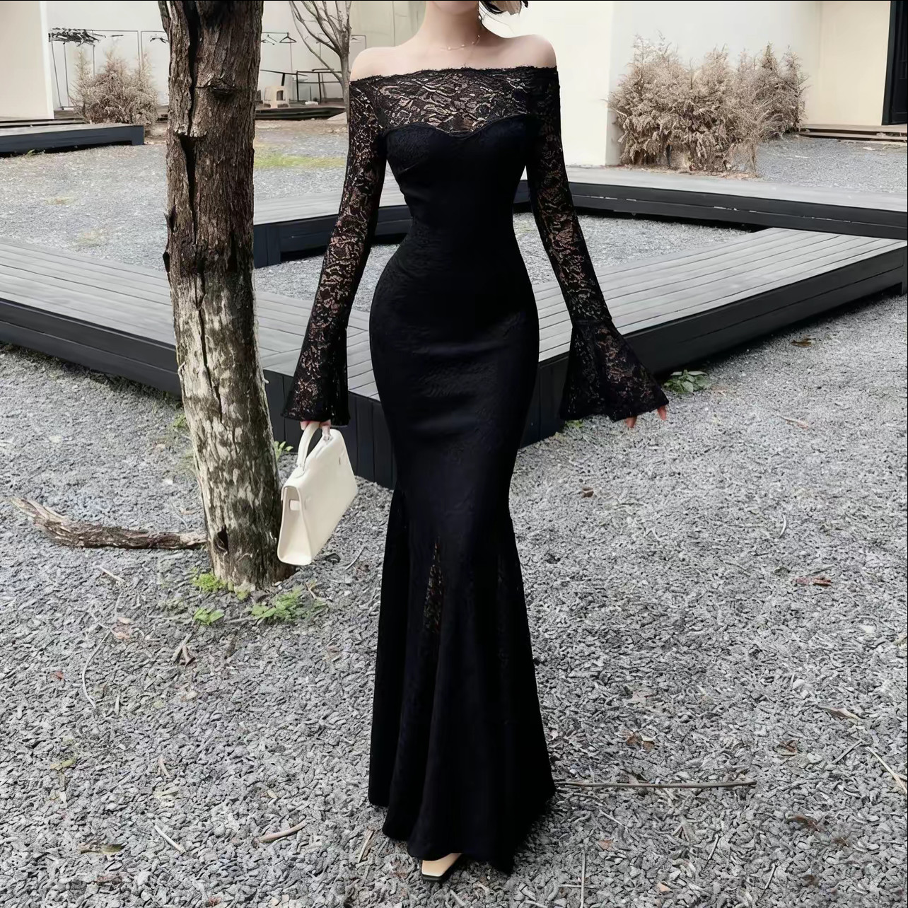 巨好看的早秋一字肩连衣裙女长袖蕾丝包臀裙秋季显瘦高级感鱼尾裙