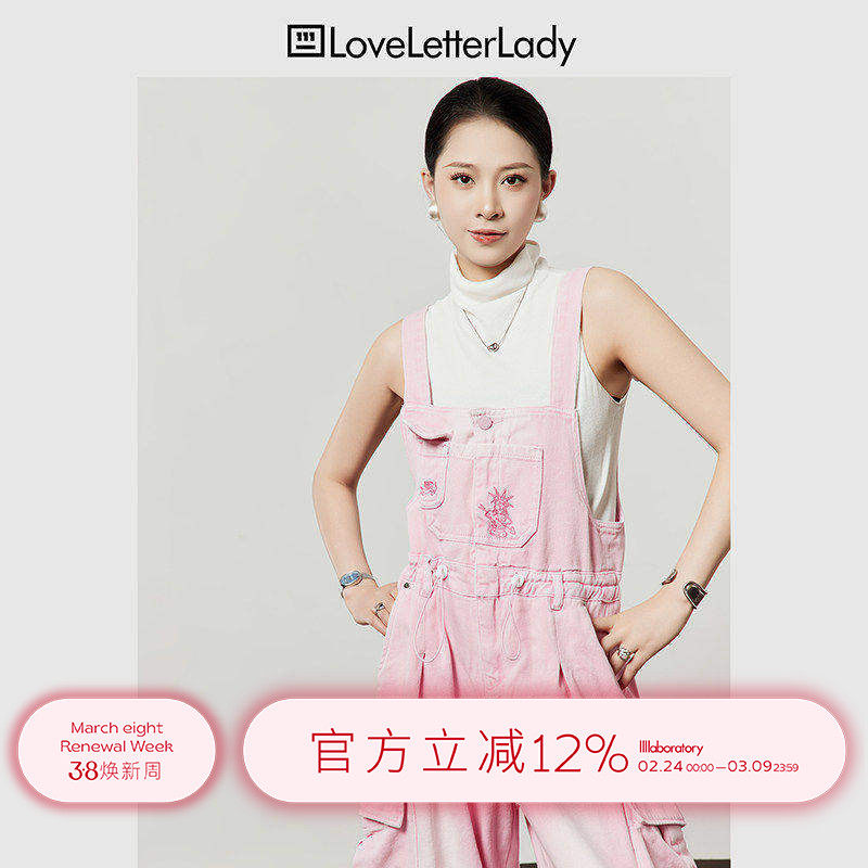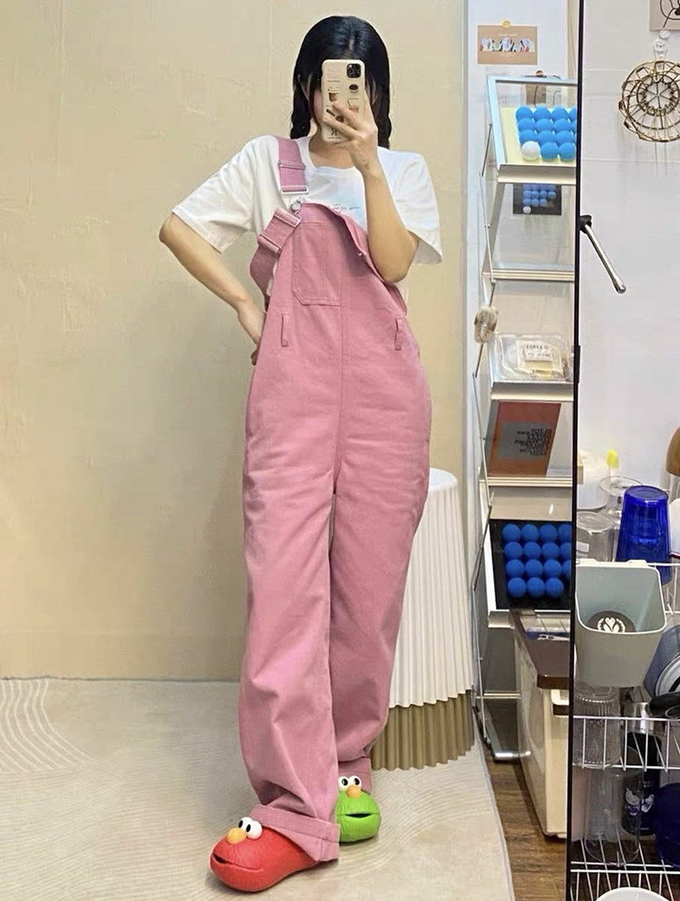 周里物/粉色水洗牛仔背带裤女2026春季新款宽松高腰俏皮裤工装裤