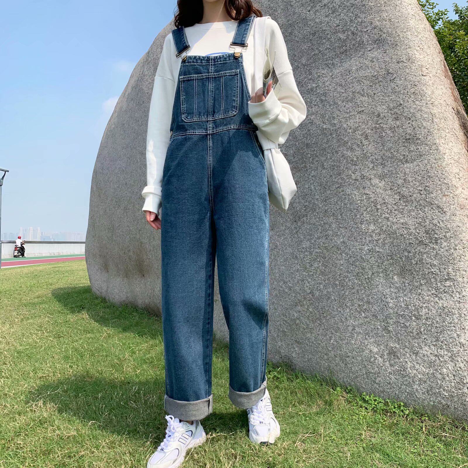 深色牛仔背带裤女韩版宽松春季直筒高腰显瘦连体裤港风chic阔腿裤