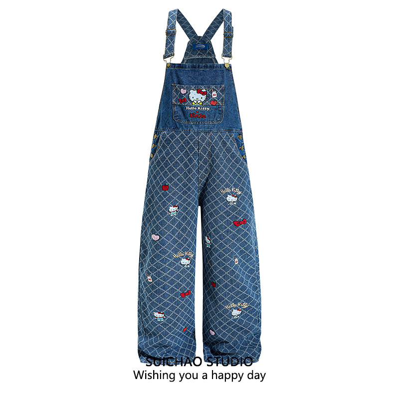SUICHAO 日系复古卡通KT猫刺绣高腰牛仔背带裤菱形格设计感连体裤