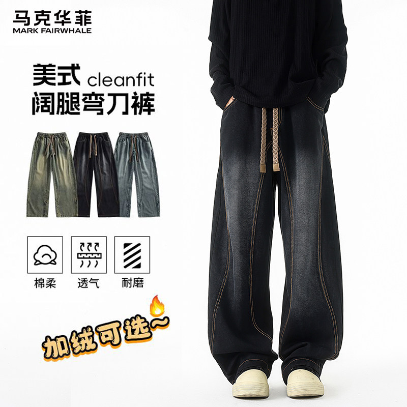 马克华菲美式牛仔裤男士秋冬季加绒加厚复古宽松男款阔腿弯刀裤子