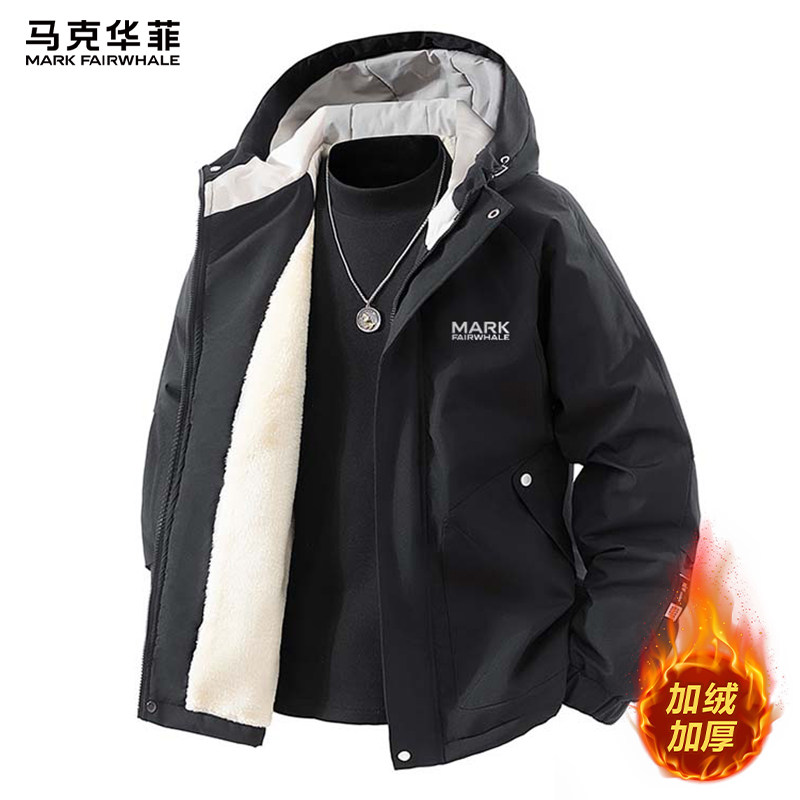 马克华菲羊羔绒连帽夹克男士外套冬季新款加绒加厚男生保暖冲锋衣