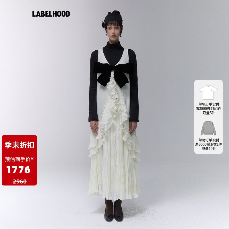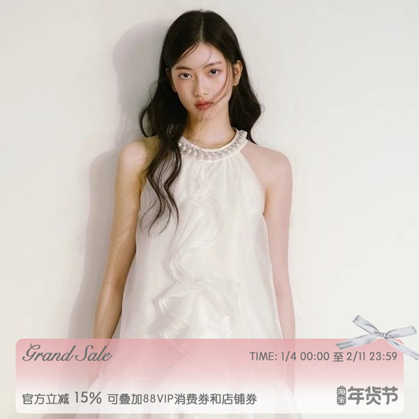 RECIT月光白层叠欧根纱系带蝴蝶结珍珠领口蓬蓬裙连衣裙千金风女
