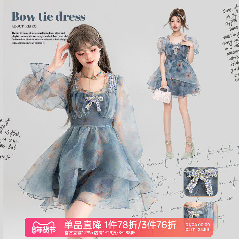 KEIKO 诗意晕染碎花短袖连衣裙2026春季仙女欧根纱蓬蓬公主裙子
