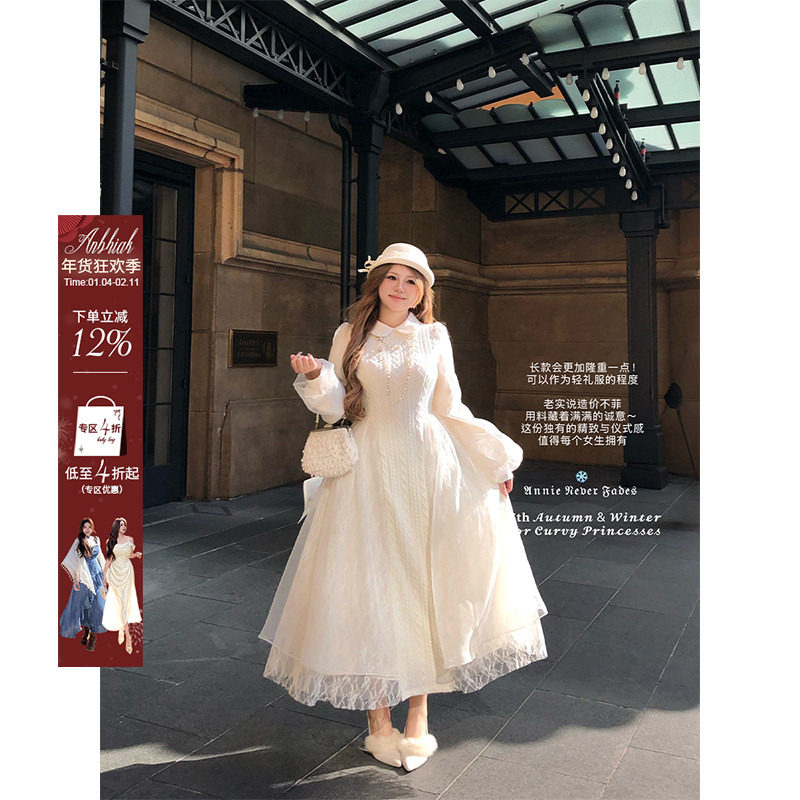 安妮不火 娃娃领欧根纱拼接绞花毛织裙女微胖大码收腰重工连衣裙