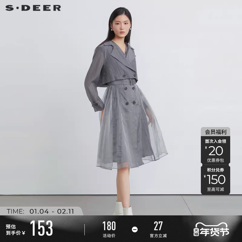 sdeer圣迪奥女装翻领收腰欧根纱连衣裙套装S223Z1406