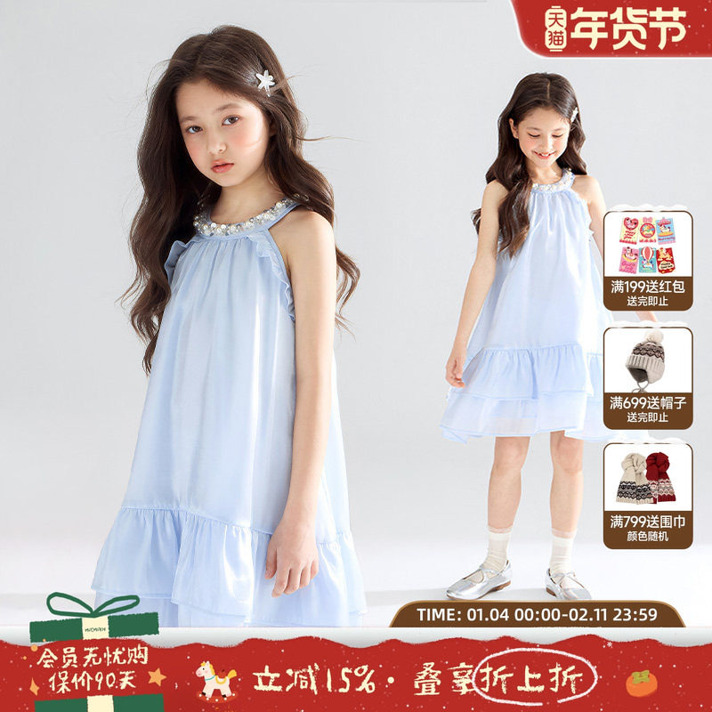 【蓝海之夏】重工珍珠亮片挂脖连衣裙 流光亮丝欧根纱轻盈女童夏