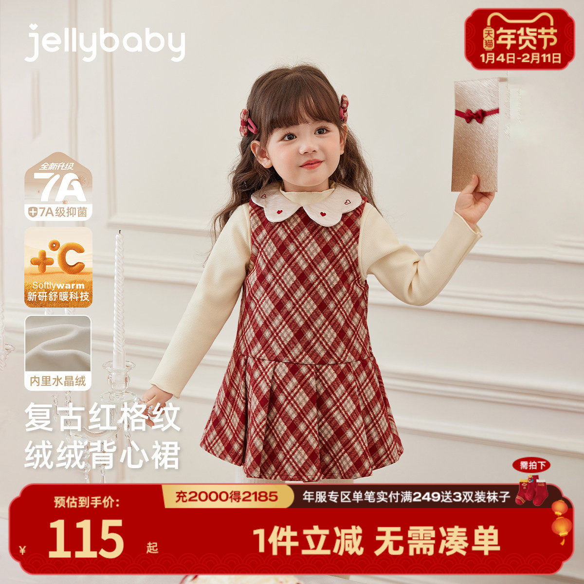 女童裙子加绒背心裙宝宝红色格纹公主裙小礼服新年连衣裙冬季新款