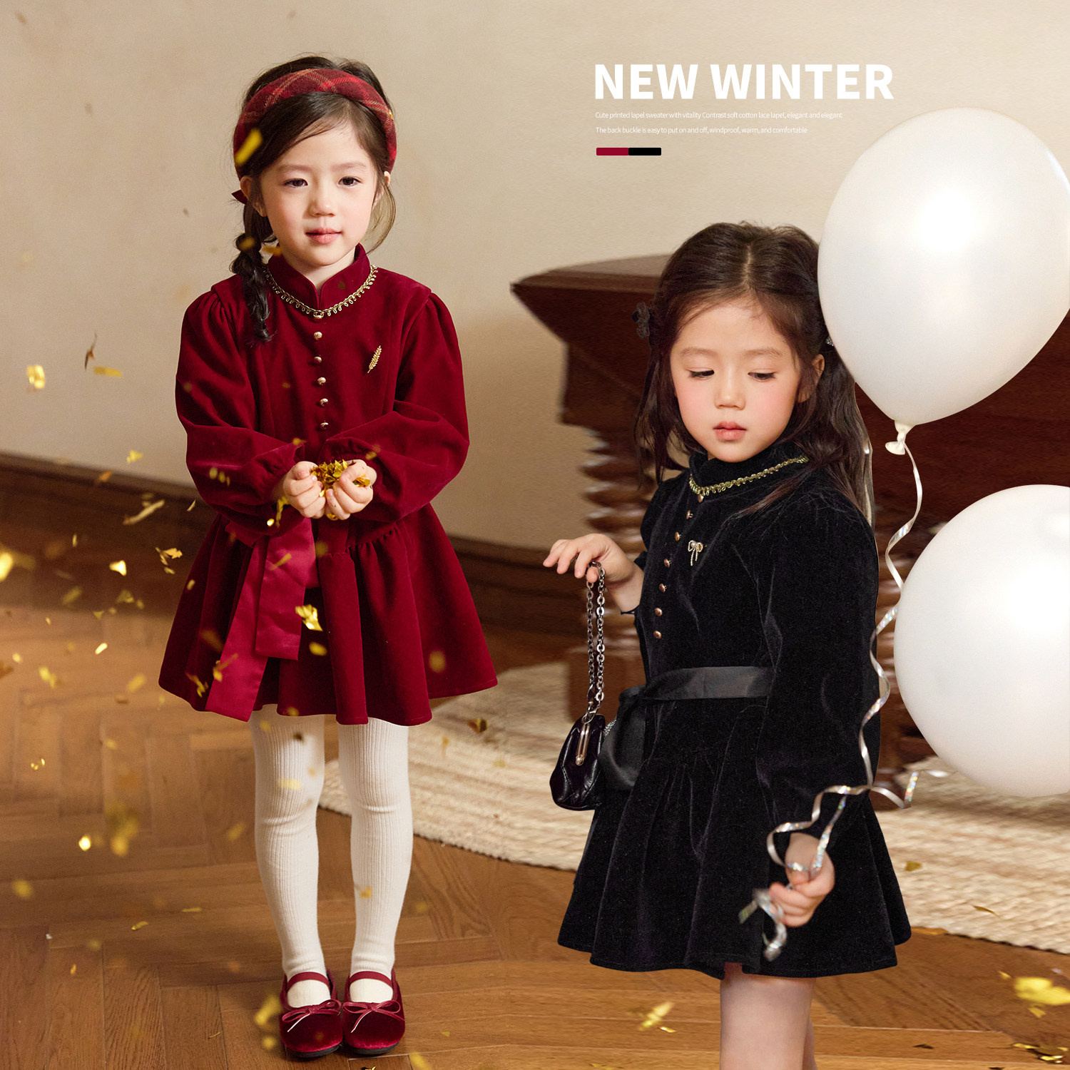INSbobo周岁女宝礼服2025冬季新款加绒红色女童连衣裙新年冬裙潮