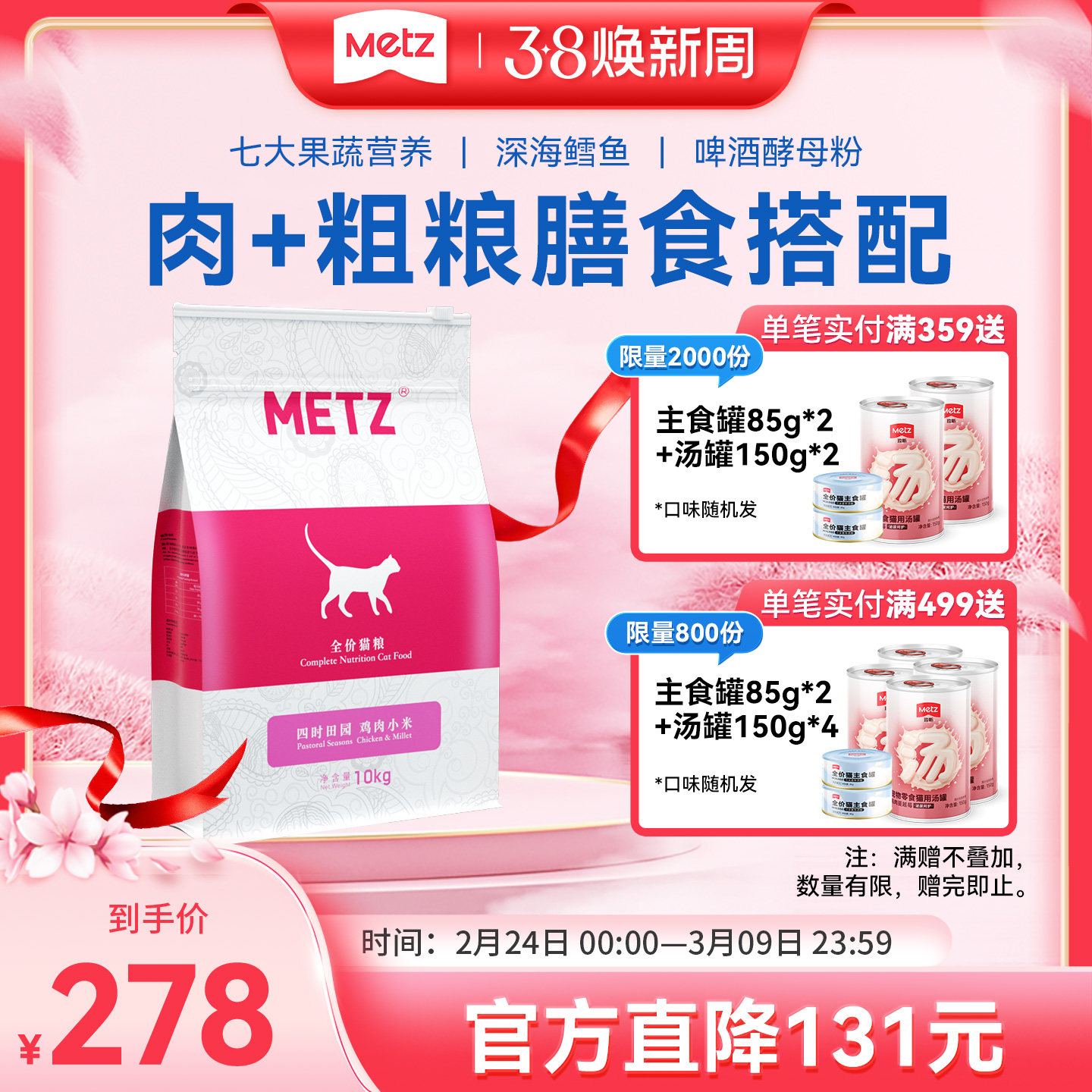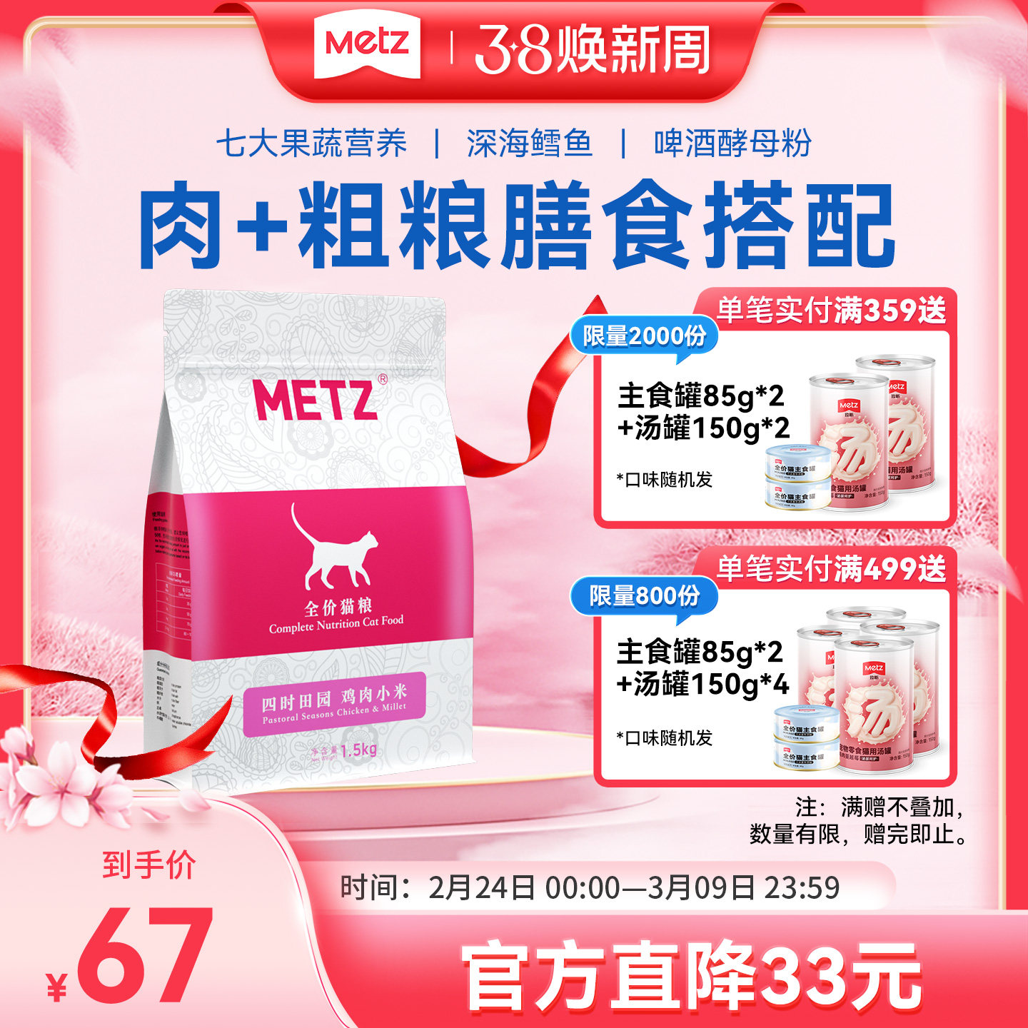 METZ/玫斯四时田园鸡肉小米全价年龄段通用营养增肥猫粮3斤1.5kg