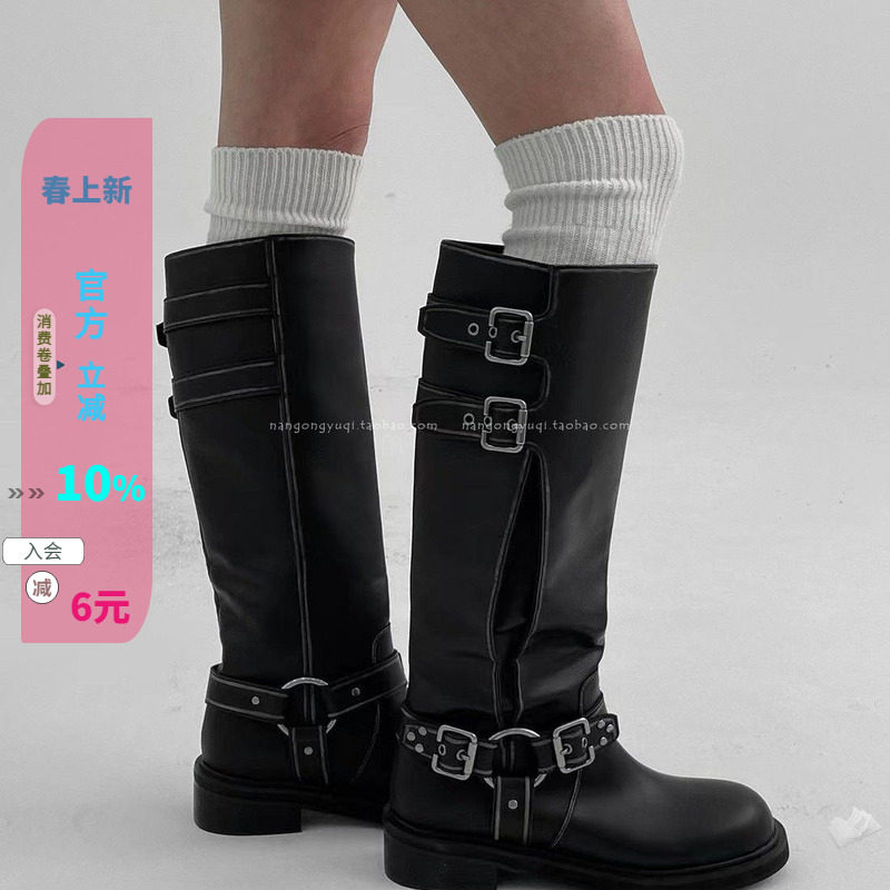 韩国小众皮带扣骑士靴女2026春夏新款复古百搭折叠褶皱长筒机车靴