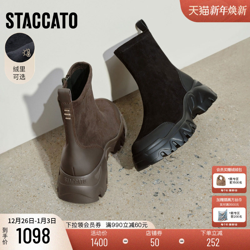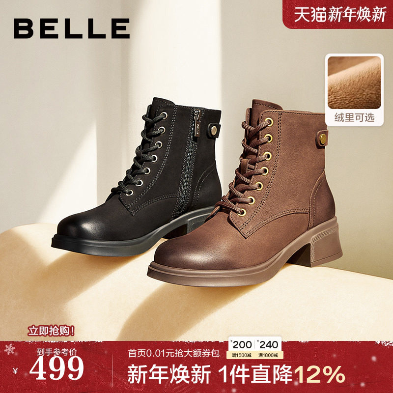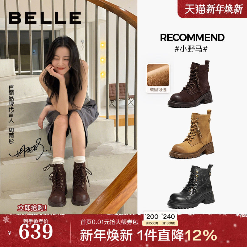 百丽靴子英伦风冬季新款粗高跟羊皮短靴加绒厚底马丁靴3NW40DD