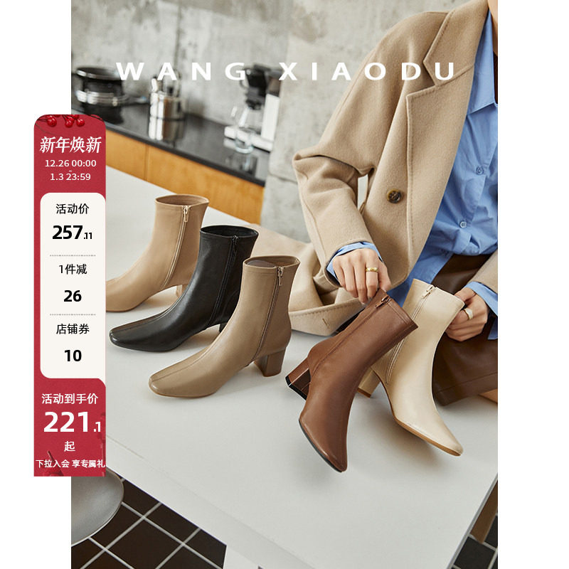 【王小毒】Z时代●真皮及裸袜靴短靴女粗高跟新款方头加绒瘦瘦靴