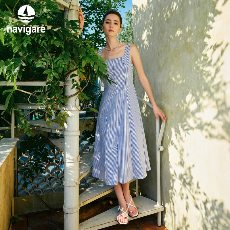 Navigare意大利小帆船百搭方领连衣裙女25夏季新款修身背带连身裙