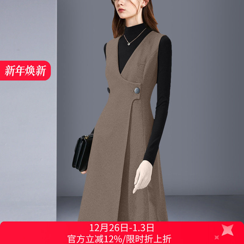 芬展秋冬新品毛呢背带裙高腰修身包臀一步裙中长款显瘦马甲连衣裙