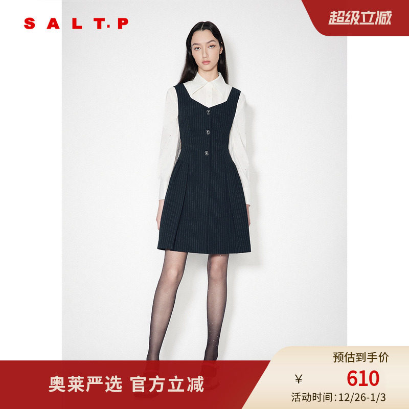 SALT.P可颜v领收腰修身显瘦复古条纹背带裙连衣裙2024秋