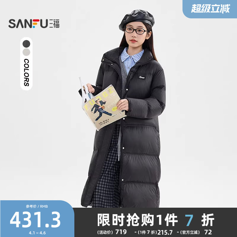 三福羽绒服女2025新款冬季可拆围巾帽宽松长款黑色外套女装506005