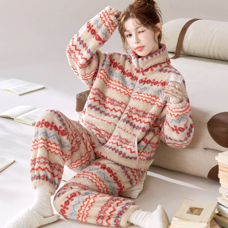 时尚立领莎粒绒秋冬天复古费尔岛睡衣可外穿女士保暖法兰绒家居服
