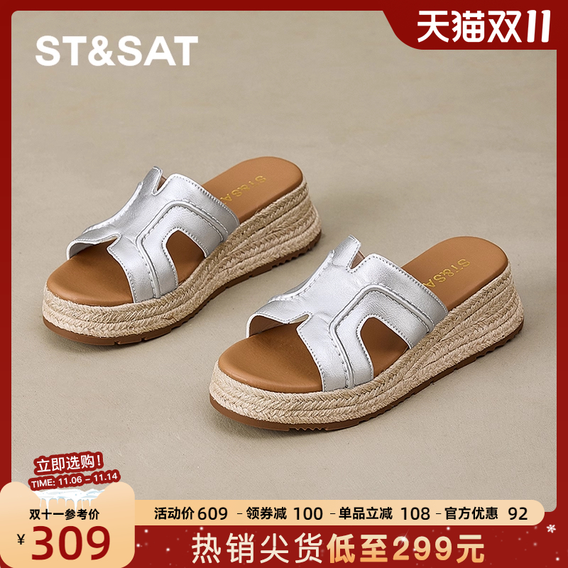 MILLIE'S/妙丽新款真皮一字凉拖鞋女夏季外穿草编松糕鞋厚底高跟