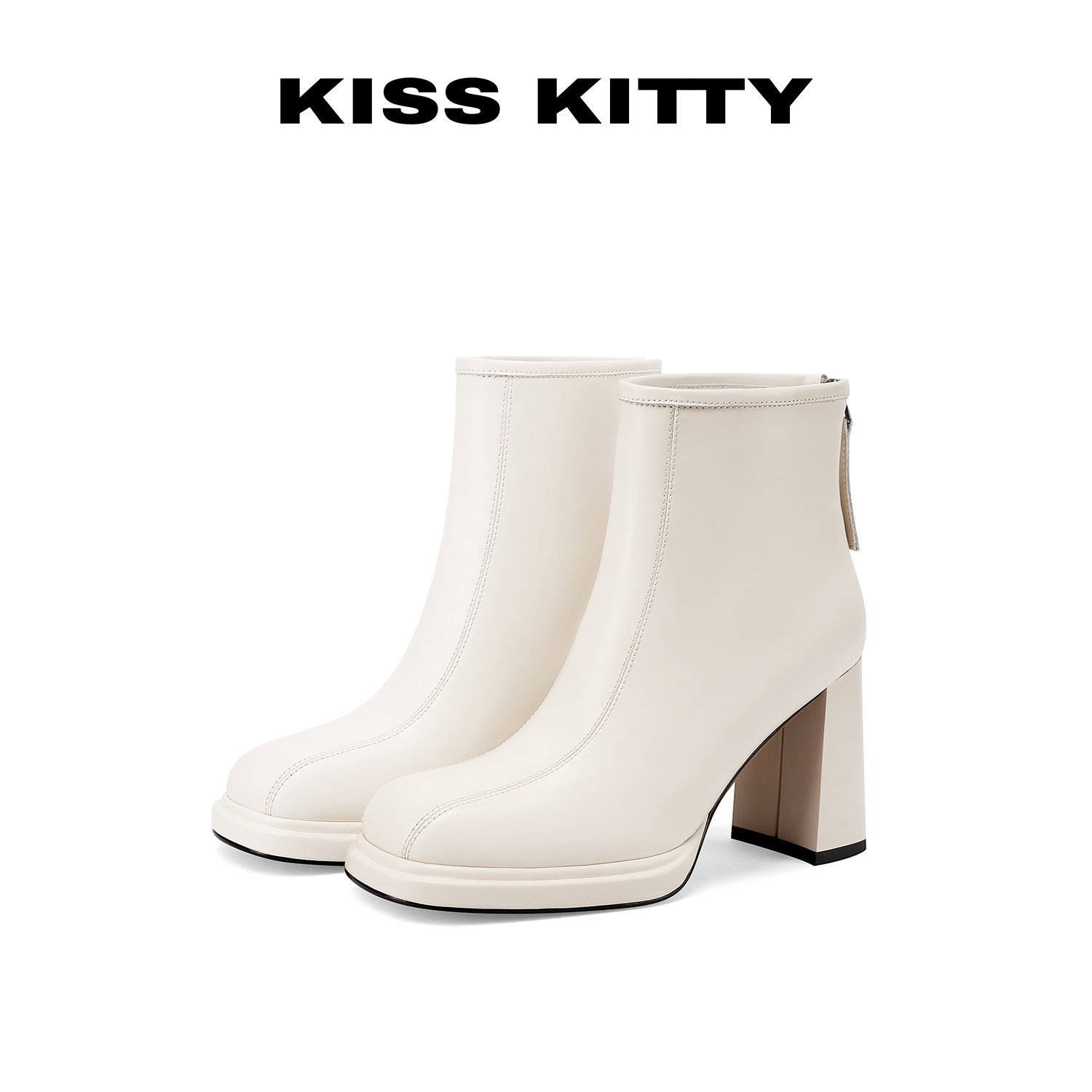 KISSKITTY弹力瘦瘦靴25新款拉链粗跟方头米色切尔西靴高跟短靴女