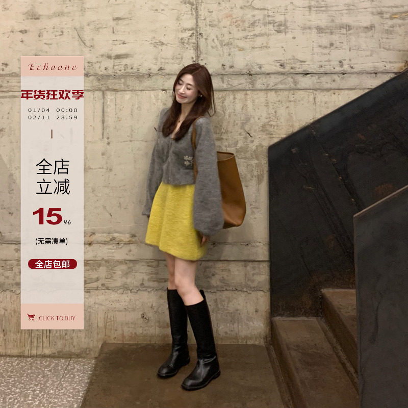Echoone Kilig 亮色系羊毛针织裙圈圈毛黄色半身裙秋冬季显瘦短裙
