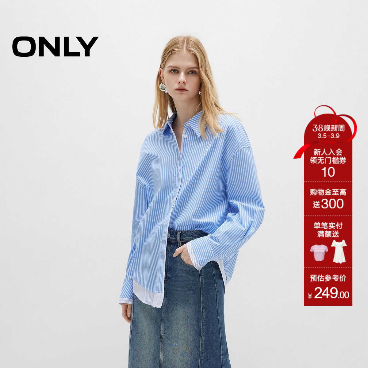 ONLY2026春季新款宽松翻领落肩条纹层次拼接假两件长袖衬衫女
